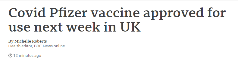 據BBC當地時間2日消息,英國政府宣布,已經根據藥品監管部門的獨立建議批准了輝瑞的新冠疫苗。預計在下周開始使用。英國《每日電訊報》稱,英國也成為了全球首個批准使用該疫苗的國家。