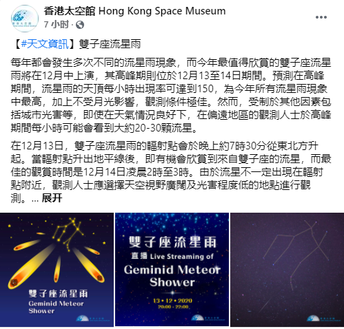 雙子座流星雨的輻射點會於12月13日晚上約7時30分從東北方升起。香港太空館表示,會於當日晚上8時至10時期間,於網上直播今次雙子座流星雨。