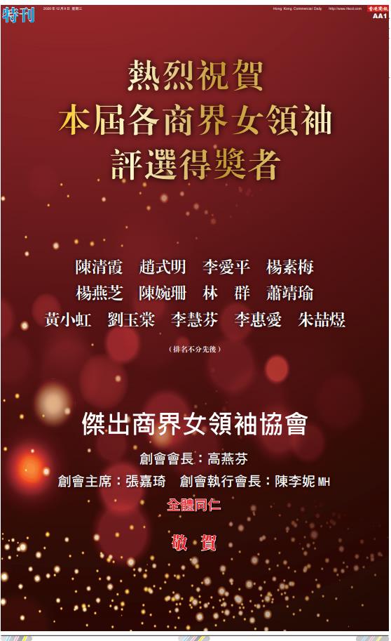 熱烈祝賀本屆各商界女領袖評選得獎者:陳清霞、趙式明、李愛平、楊素梅、楊燕芝、陳婉珊、林群、蕭靖瑜、黃小虹、劉玉棠、李慧芬、李惠愛、朱喆煜(排名不分先後)