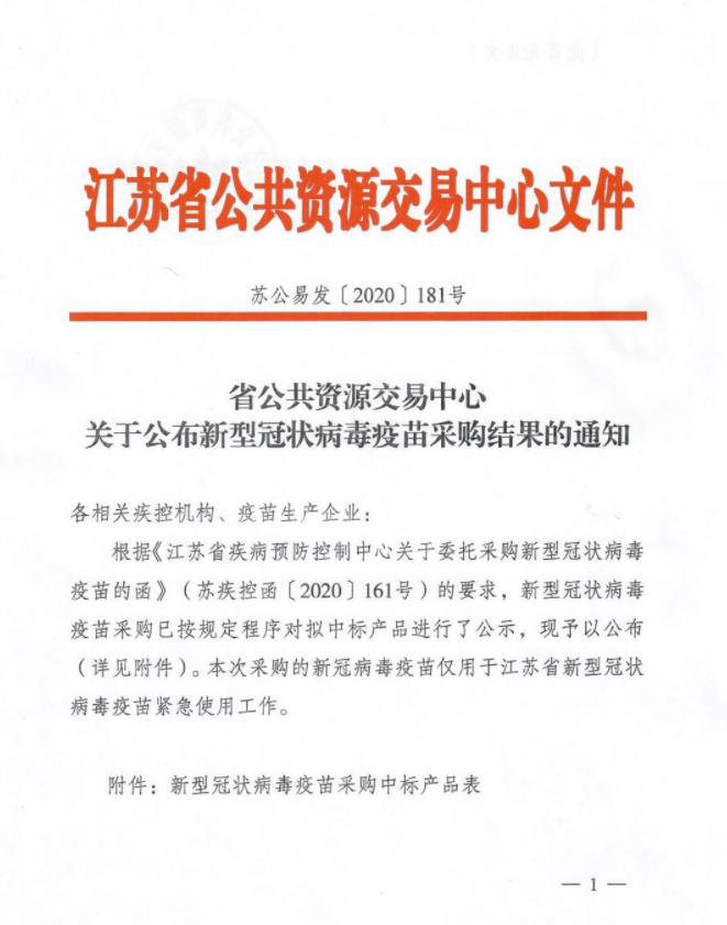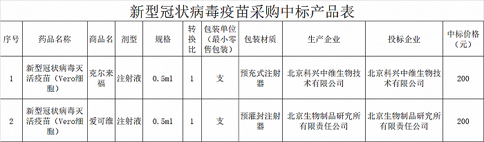 12月15日,江蘇省藥品(醫用耗材)陽光採購和綜合監管平台發布《省公共資源交易中心關於公布新型冠狀病毒疫苗採購結果的通知》,北京科興中維生物技術有限公司和北京生物製品研究所有限公司中標,中標價格均為200元/支。