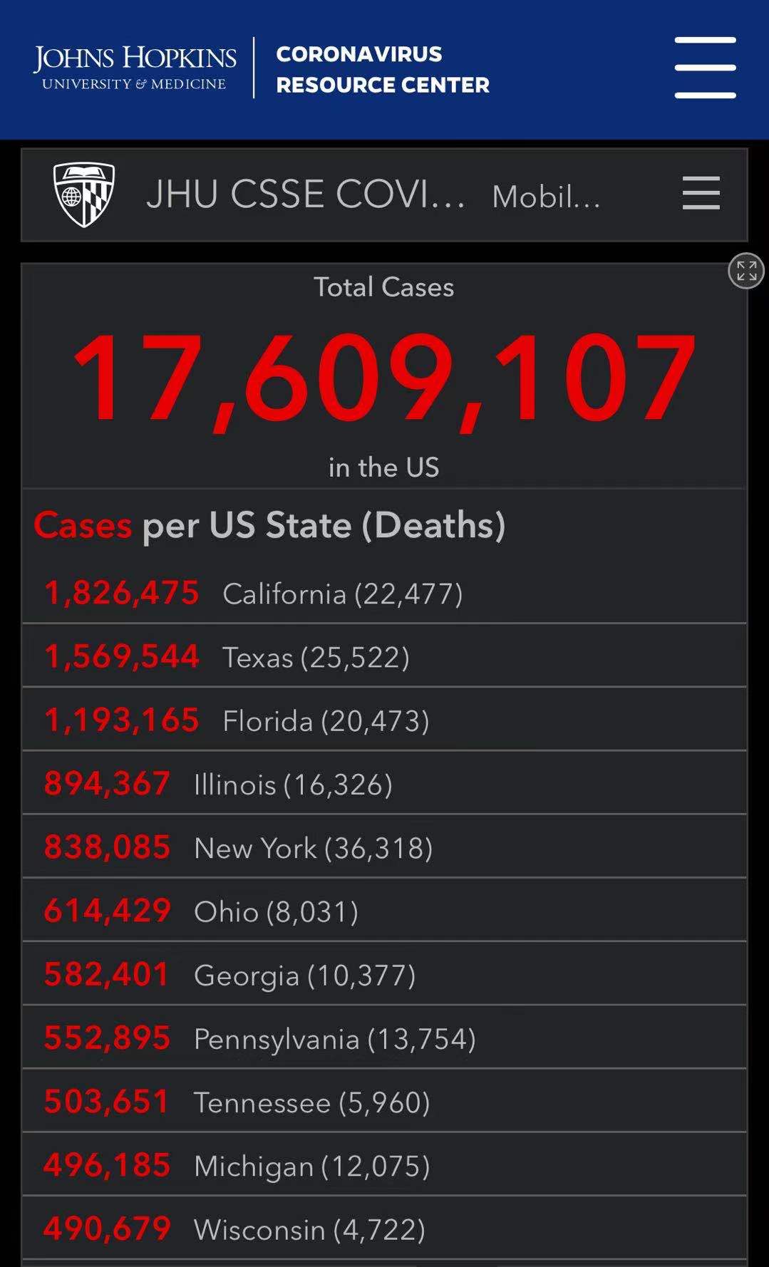 美國約翰斯·霍普金斯大學實時統計數據顯示,截至香港時間今日7時27分,美國累計新冠肺炎確診病例達17609107例,累計新冠肺炎病例死亡病例達315174例。與24小時前相比,美國新增確診病例213830例,新增死亡病例2452例。