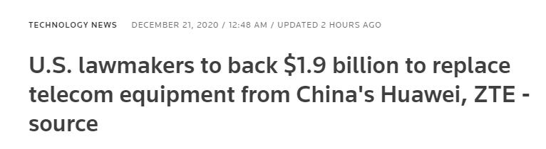路透社最新消息稱,據一位知情人士當地時間20日透露,美國國會預計批准一項19億美元資金,以支持一項移除那些被美國政府認為對所謂「國家安全」構成風險電信網絡設備的計劃。據稱,該計劃也是美聯邦政府年底支出法案以及新冠疫情紓困計劃法案的一部分。
