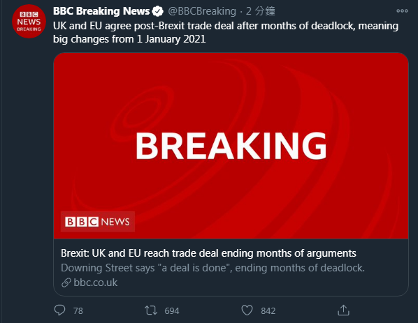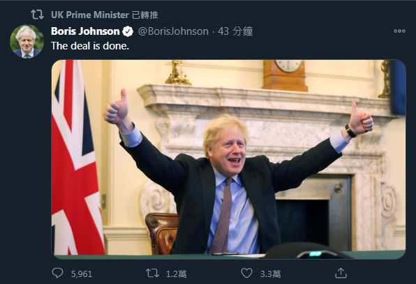 英國首相約翰遜隨後在社交媒體發文稱,「協議已經達成」。