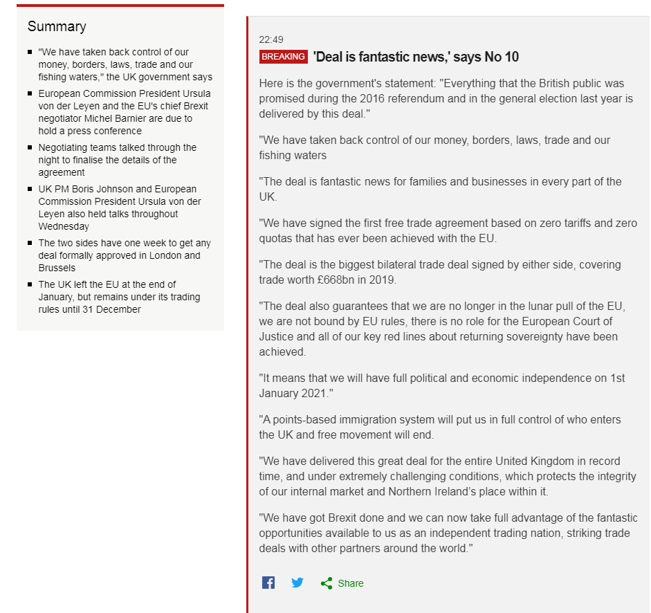 聲明指出,這項協議還保證英國不再受到歐盟的拖延,不受歐盟規則的約束,歐洲法院不再有任何作用。英國已經實現了所有關於主權回歸的關鍵控制權,這意味着英國將於2021年1月1日實現全面的政治和經濟獨立。