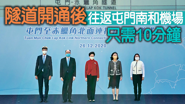 連接屯門及機場的屯門赤鱲角隧道(屯赤隧道)27日早上8時通車,行政長官林鄭月娥今(26日)早主持通車儀式,其他主禮嘉賓還包括運輸及房屋局局長陳帆、運輸及房屋局常任秘書長(運輸)陳美寶、運輸署署長羅淑佩及路政署署長陳派明等。