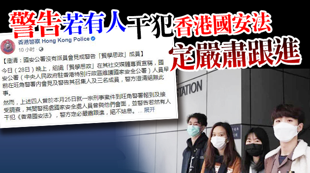 一個聲稱「賢學思政」的學生組織在社交媒體專頁上表示,召集人王逸戰及3名成員早前於旺角警署內與國安公署人員見面,國安公署人員指「賢學思政」的行動及言語已觸犯香港國安法,警方亦澄清絕無其事。