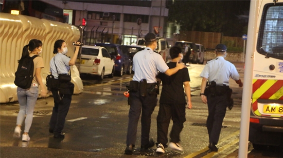 張建宗(右一)與駐守檢疫中心的警務人員交談。