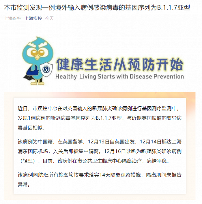 1月1日,上海疾控發布通報:近日,市疾控中心在對英國輸入的新冠肺炎確診病例進行基因測序監測中,發現1例病例的新冠病毒基因序列為B.1.1.7亞型,與近期英國報道的變異病毒基因相似。