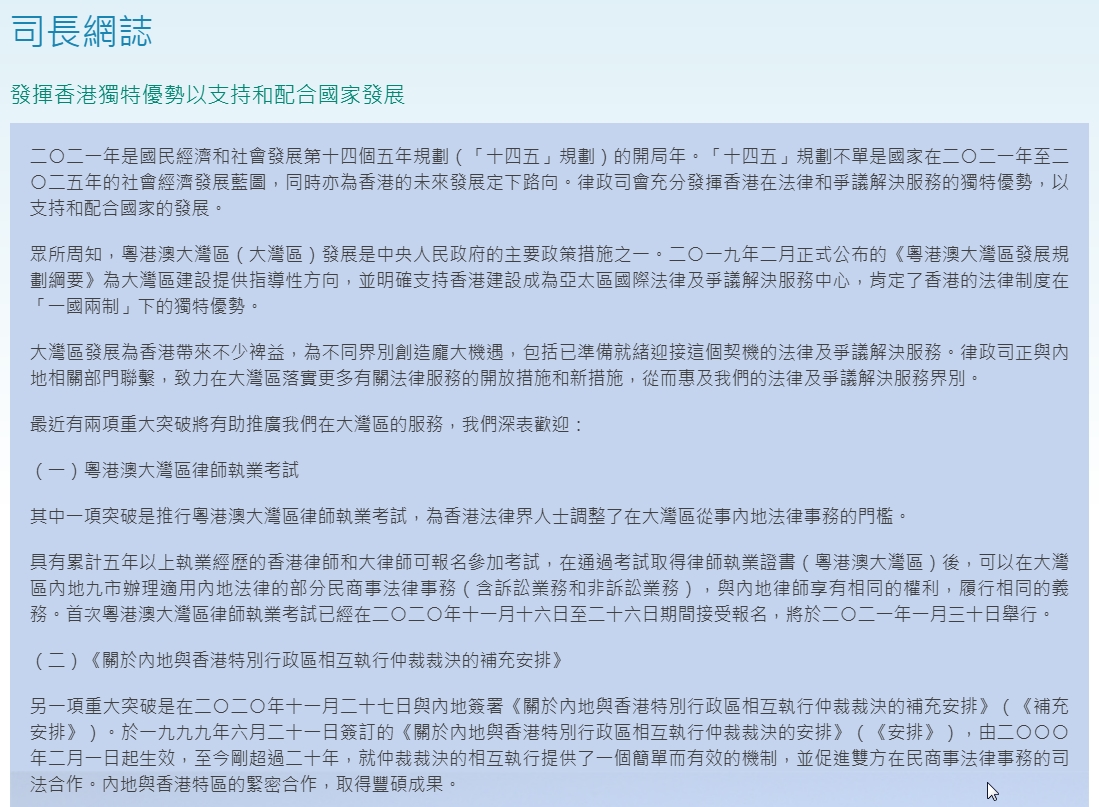 律政司司長鄭若驊發表網誌指,今年是國家「十四五」規劃開局年。律政司會充分發揮香港在法律和爭議解決服務的獨特優勢,以支持和配合國家的發展。律政司正與內地相關部門聯繫,致力在大灣區落實更多有關法律服務的開放措施和新措施,從而惠及法律及爭議解決服務界別。