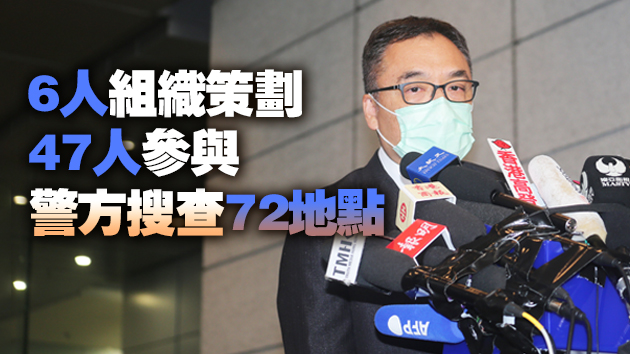 警方國家安全處高級警司李桂華今日(6日)下午举行记者会,交代早上拘捕逾50名涉嫌违反香港国安法的反对派人士详情。他表示,警方今日出動1000名警務人員,包括來自國安處、刑事總部、機動部隊等,針對一個組織策劃和參與所謂「35+」和「攬炒」癱瘓香港的計划,拘捕53人,包括45男8女,年齡23至64歲,涉嫌顛覆國家政權罪。其中6人的角色是組織和策劃,另外47人涉嫌參與。