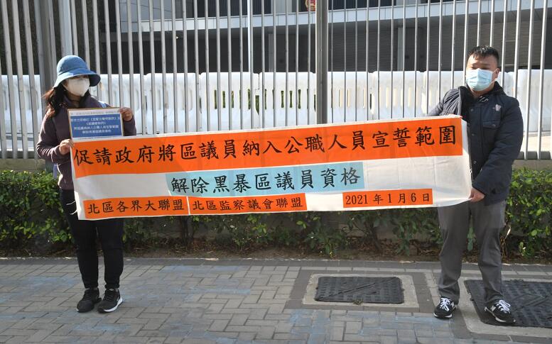 團體「北區各界大聯盟」、「北區監察議會聯盟」今日(6日)到政府總部請願,表達對近期涉及「黑金黑暴」區議員的不滿,並促請政府修訂《宜誓及聲明條例》,解除相關區議員資格。