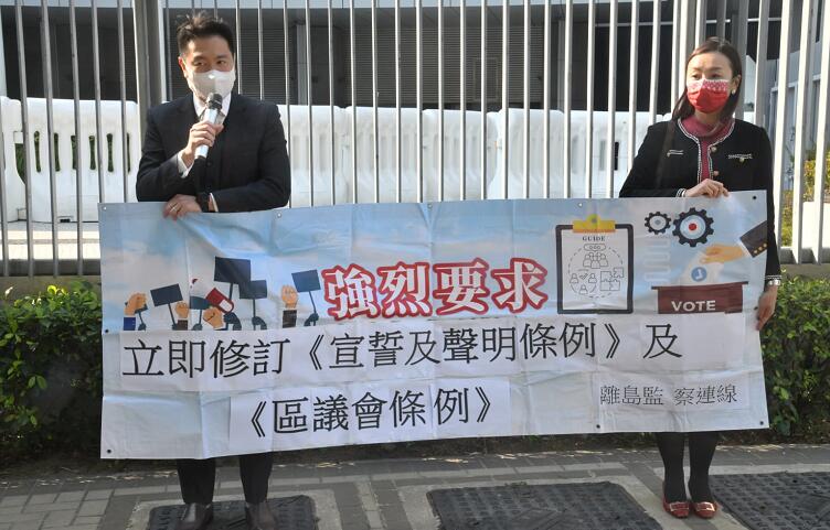 此外,團體「離島監察連線」、「西貢監察議會連線」亦有到場請願,要求政府修例,規定區議員須符合宣誓要求。(記者馮煒強)