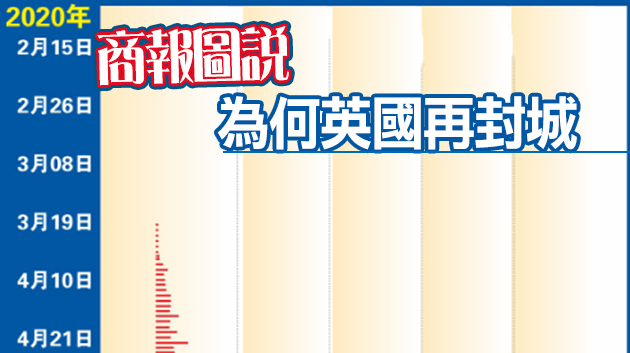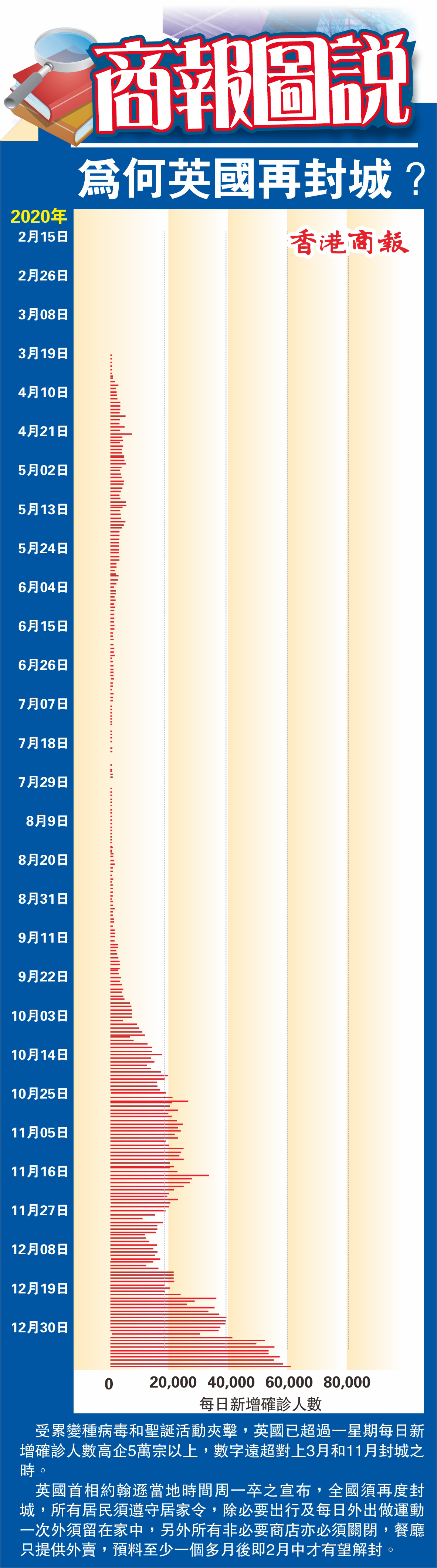 英國首相約翰遜當地時間周一(1月4日)卒之宣布,全國須再度封城,所有居民須遵守居家令,除必要出行及每日外出做運動一次外,所有人須留在家中,另外所有非必要商店亦必須關閉,餐廳只提供外賣,預料至少一個多月後即2月中才有望解封。