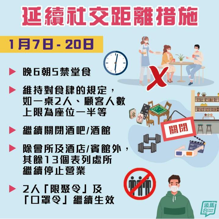 有關措施包括晚6朝5禁堂食;維持對食肆的規定,包括每桌限坐2人、顧客不超過座位數目一半等;繼續關閉酒吧/酒館;除會所及酒店/賓館外,其餘13個表列處所繼續停止營業;2人「限聚令」及「口罩令」繼續實施。
