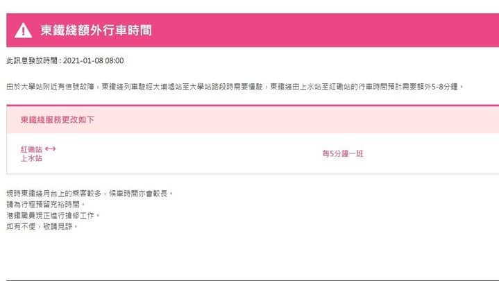 港鐵指,大學站附近有信號故障,東鐵綫列車駛經大埔墟站至大學站路段時需要慢駛,現時東鐵綫往返紅磡站至上水站每5分鐘一班,上水至紅磡行車時間預計需要額外5至8分鐘。