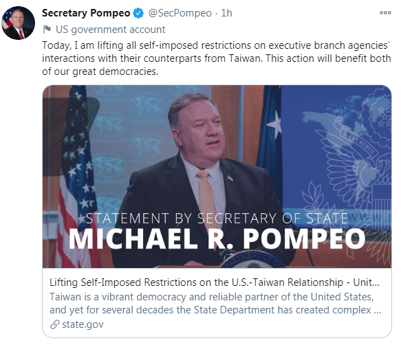 美國國務卿蓬佩奧9日在推特上發文,宣稱美方將停止美國官方在與台灣接觸上的限制。