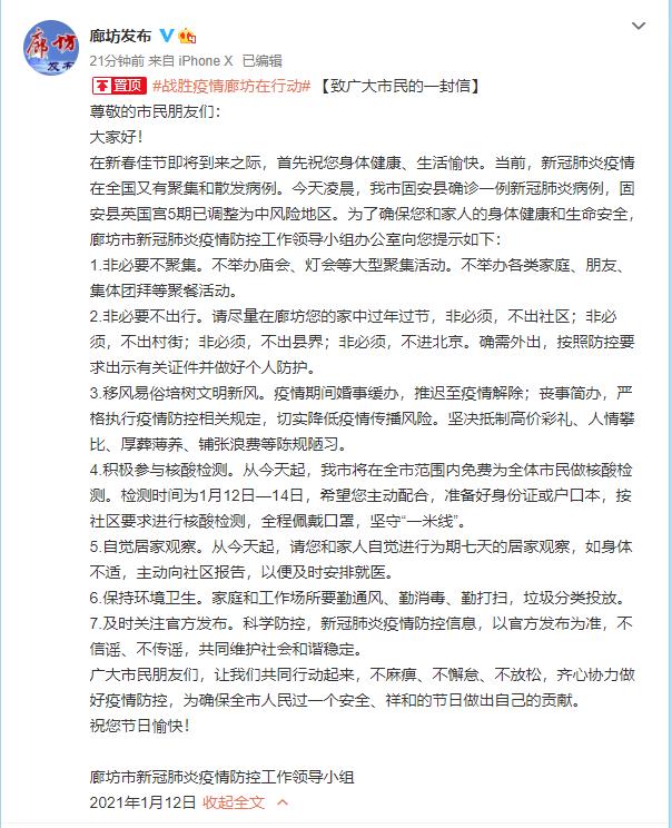 1月12日,河北省廊坊市新冠肺炎疫情防控工作領導小組向市民發出倡議信:從今天起,請市民自覺進行為期七天的居家觀察;從今天起,廊坊市將在全市範圍內免費為全體市民做核酸檢測,檢測時間為1月12日—14日;請市民儘量在廊坊的家中過年過節,非必須,不出社區;非必須,不出村街;非必須,不出縣界;非必須,不進北京。原文如下: