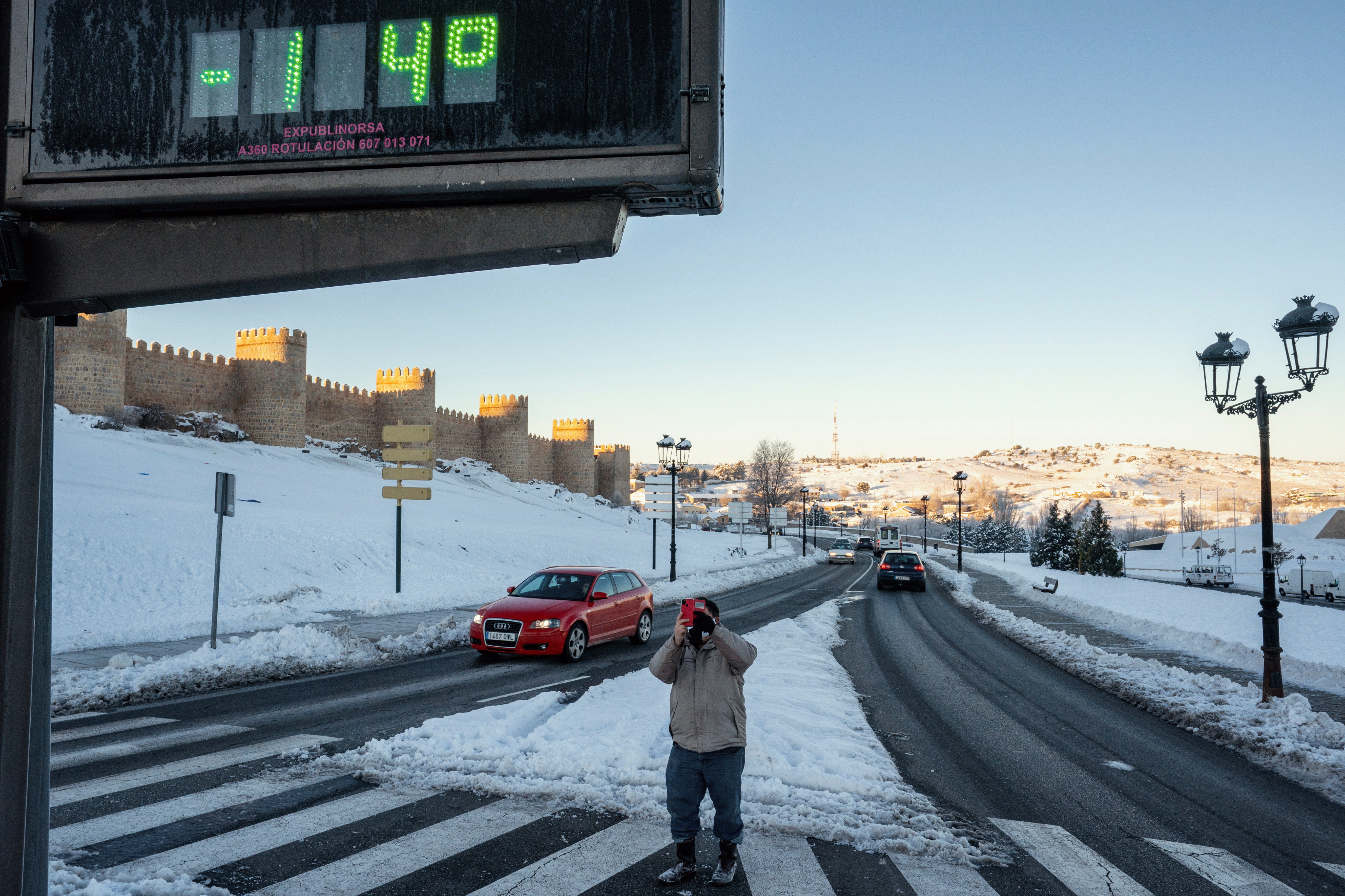 1月12日,一名男子在西班牙阿維拉拍了攝氏零下14度的溫度計的照片。EPA