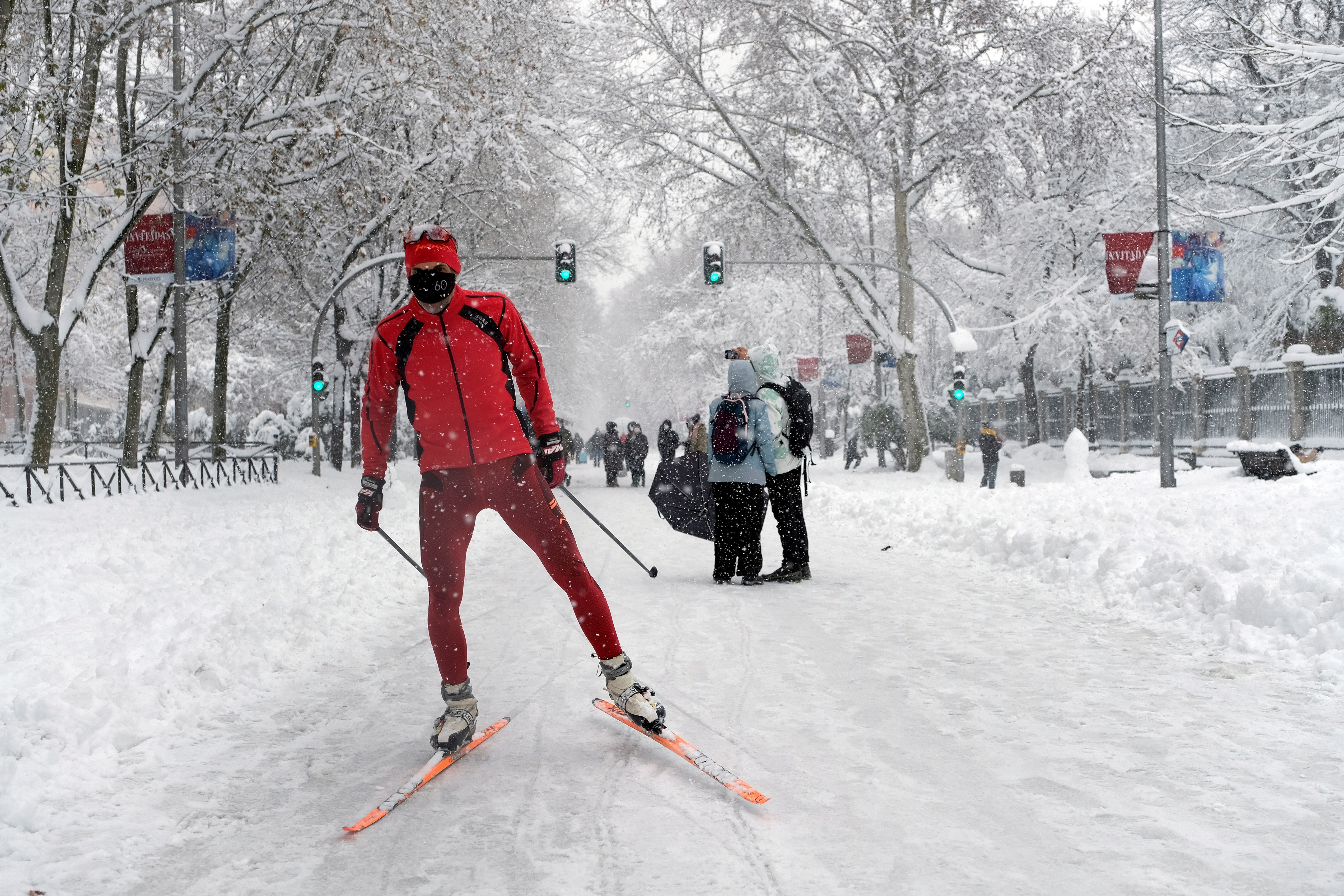 1月9日,在西班牙馬德里,一名男子滑雪出行。