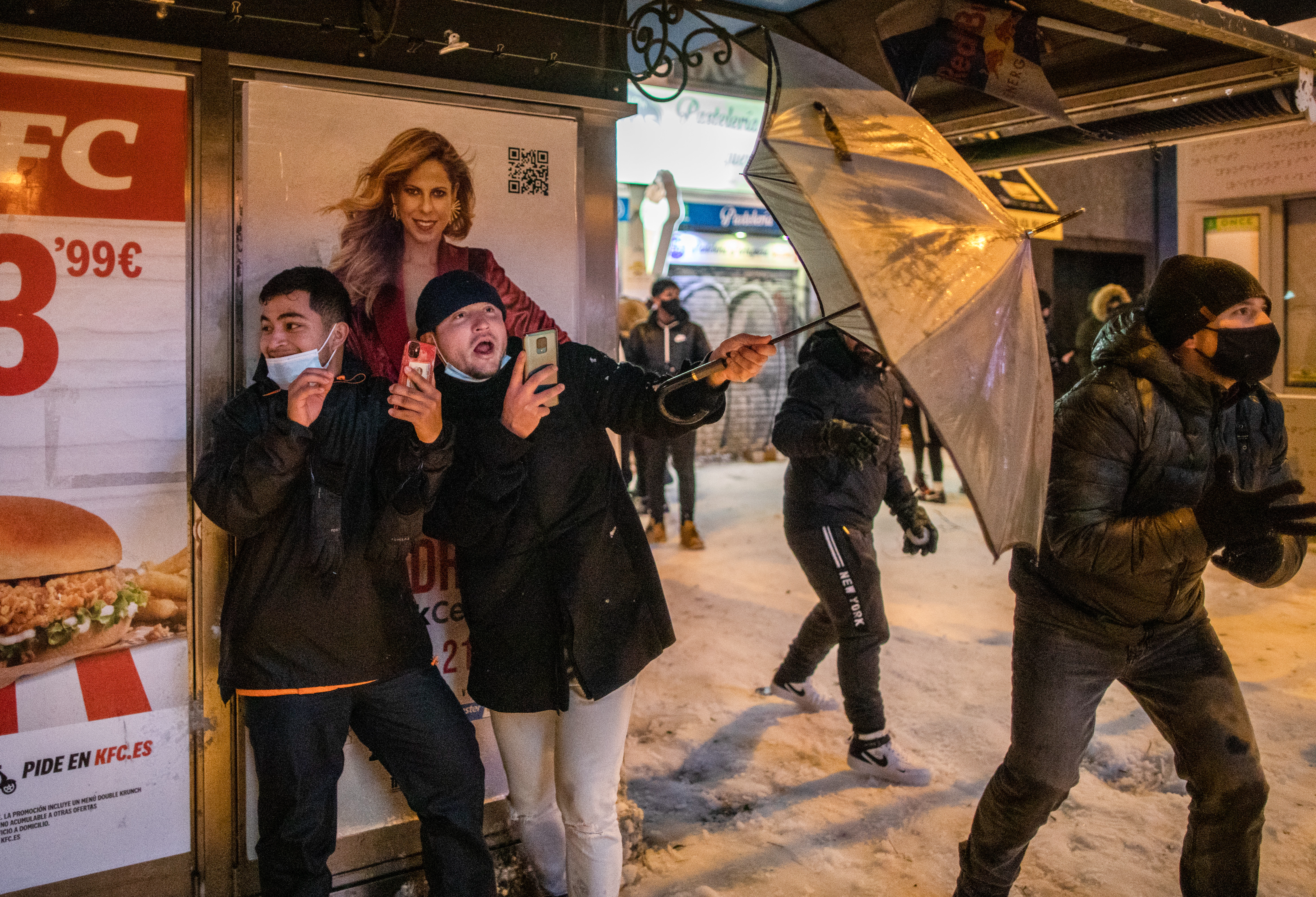 1月9日,人們在西班牙馬德里街頭打雪仗。