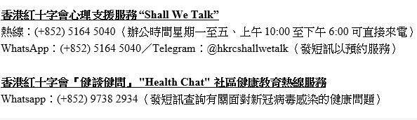 紅十字會為任何有需要的市民提供身心支援熱線服務,包括心理支援服務 「Shall We Talk」及「健談健問」社區健康教育熱線服務。