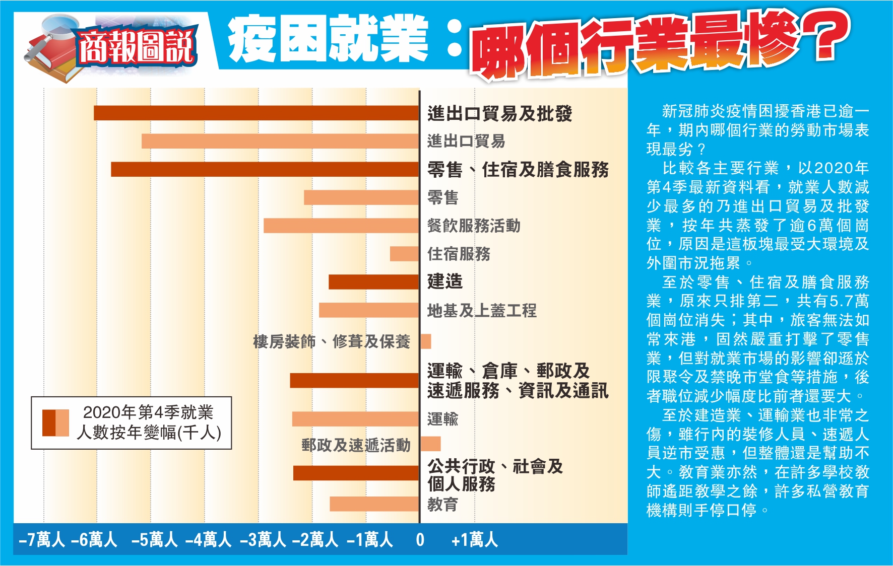 比較各主要行業,以2020年第4季最新資料看,就業人數減少最多的乃進出口貿易及批發業,按年共蒸發了逾6萬個崗位,原因是這板塊最受大環境及外圍市況拖累。