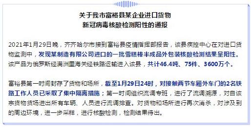 據鶴城發布,2021年1月29日晚,齊齊哈爾市接到富裕縣疫情指揮部報告,該縣疾控中心在對進口貨物監測中,發現某製造有限公司進口的一批雪糕棒半成品外包裝核酸檢測結果呈陽性。該產品為俄羅斯經滿洲裏海關經鐵路運輸進入該縣,共計46.4噸、75件、3600萬個。