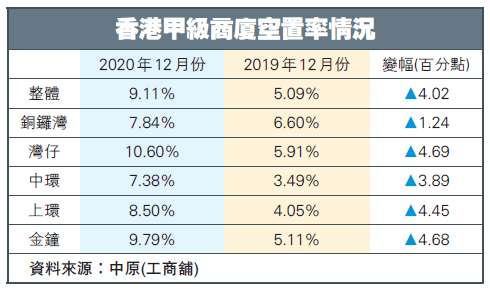 中原(工商舖)資料最新顯示,2020年12月港島核心區甲廈整體空置率升至約9.11%,比11月稍微增加0.26個百分點。美聯工商舖同日數據顯示,目前市場更青睞細銀碼九龍、新界寫字樓,市場觀望氣氛仍然十分濃厚。