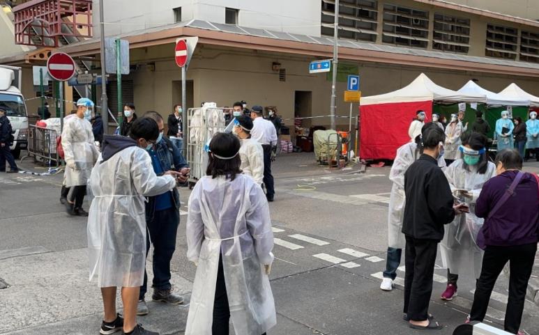 封鎖區佐敦長樂街百樂大廈居民接受病毒測試,並領取食物。(蔡啟文攝)
