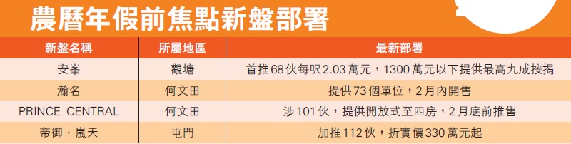 新盤趕在農曆新年檔期吸客,華懋集團觀塘項目安峯7日公布首張價單,涉68個單位,面積377至831平方呎,戶型由一房至三房,分布第1至3座,提供最高20%折扣優惠,折實平均呎價20363元,一房折實售價由792.9萬元起。