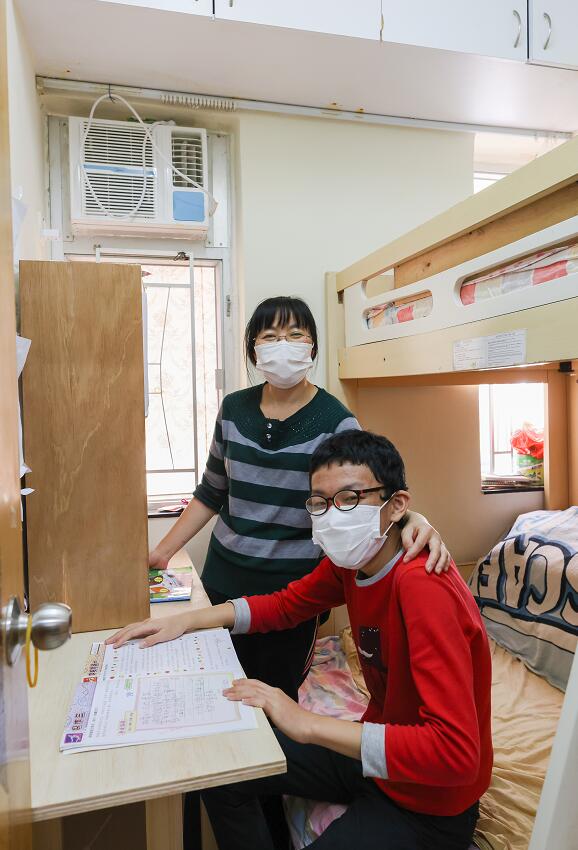 另一受惠個案的郭女士,原本居於市建局土瓜灣庇利街/榮光街重建項目一單位,她現在已搬至同區另一唐樓單位居住。她的孩子房間因為空間有限,沒有合適的書桌供兩位兒子學習使用,哥哥只能在床架上放置木板充當書桌, 而弟弟則只能在床上做功課,故此他們有一個小小心願,就是希望能有一張書桌來好好學習。