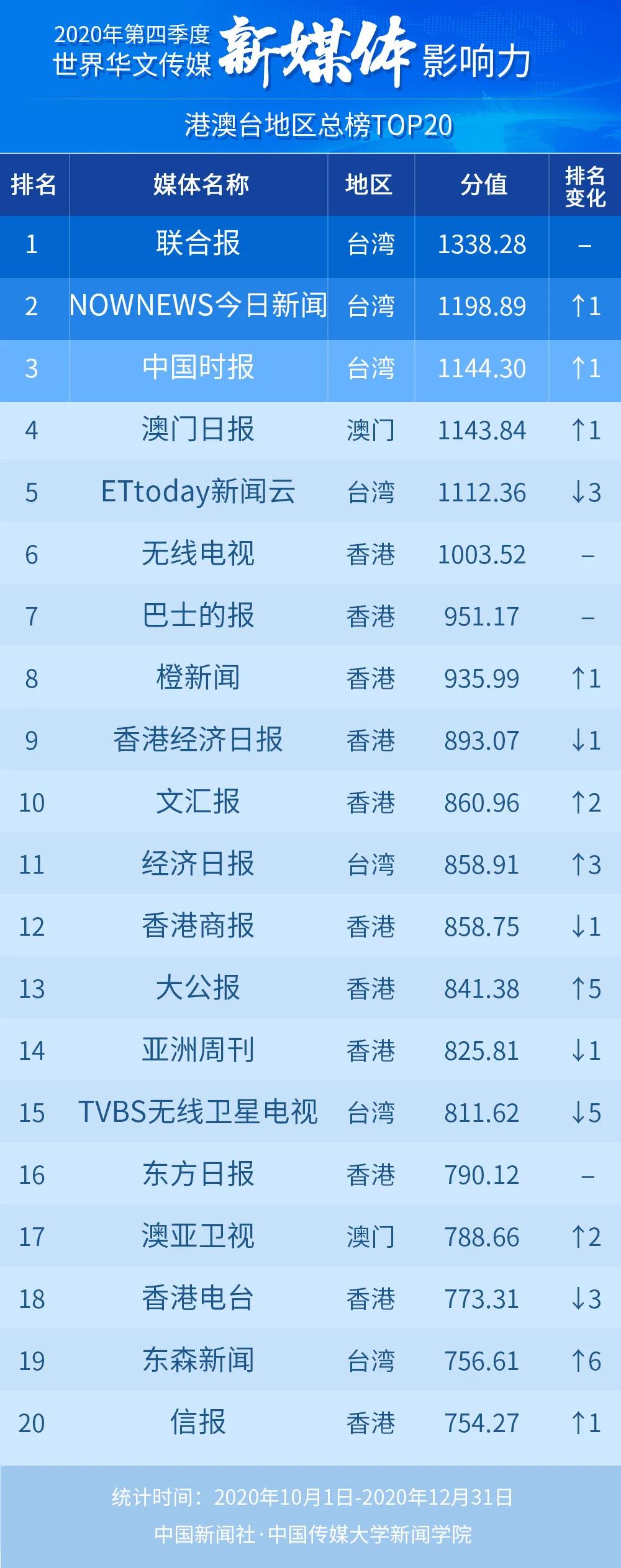 據了解,榜單根據2020年第四季度世界華文傳媒新媒體的業務數據發布季度榜單,其排名僅體現各媒體該季度在新媒體平台開展業務的情況和傳播效果,其傳統業務的規模、實力和表現未納入測評,並不必然反映媒體的整體實力和地位。