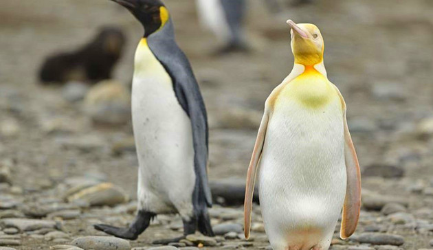 據外媒報道,近日,一位野生動物攝影師到南喬治亞島考察時,發現一隻長有黃色羽毛的企鵝,他隨即舉機拍攝,相信是有史以來首次發現有金黃色企鵝的存在。