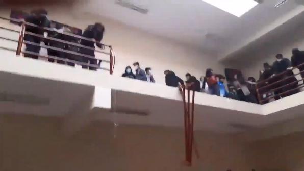 社交媒體上的視頻片段顯示,由於眾多學生擠在教學樓的走廊內過於擁擠,走廊護欄不堪重負突然折斷,多名學生當場從四樓摔下。現場頓時一片混亂,原本擁擠的人群也都散去。片段可見墜樓事故發生時,樓道里有學生發生爭執,引起混亂。