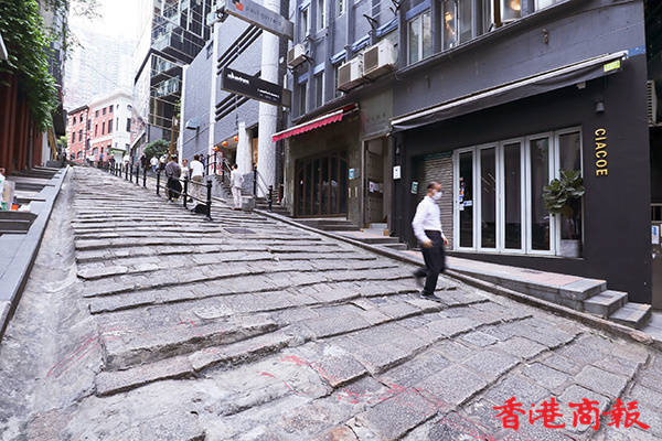 已有150年的石板街仍然歷久不衰,沿着斑斕、灰白相間的石板步道,兩旁有不少小店,如:面具店、裁縫店、二手舊書店、復古服飾店等,穿插現代感強烈的食肆、酒吧,比鄰交錯在古老街邊,對照著隔街上聳立的國際金融中心、購物中心,形成強烈對比卻又不違和的中環風情,讓遊客印象深刻。