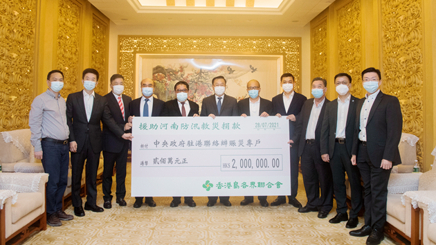 7月29日上午,香港島各界聯合會將募得的200萬港元救災善款移交中聯辦,由中聯辦何靖副主任、港島工作部薛惠君部長代為接收,並轉送河南省相關部門支援抗洪救災,為災區人民提供幫助。