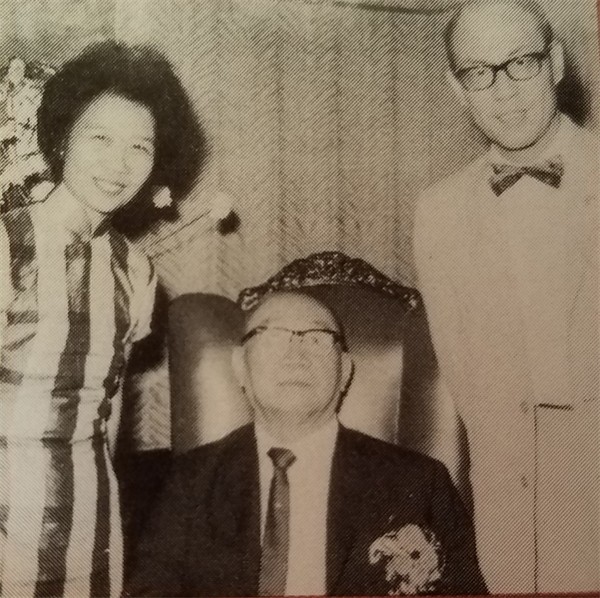 63年,孔祥熙(中)自美國回台灣過80大壽跟方劉小梅父母親合照。(此照片攝於台北圓山大飯店)