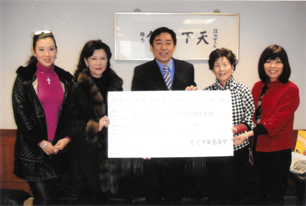 方劉小梅(左二)帶領香港中華基金會同仁捐助九二一台灣大地震受災者,並由駐港台北經濟文化辦事處處長楊家駿(左三)於香港接收支票。