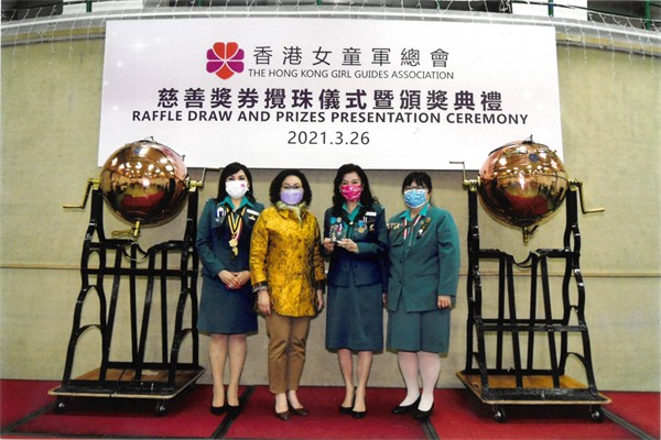 女童軍總會會長梁唐青儀(左二)與名譽副會長方劉小梅(左三)共同主持慈善獎券攪珠儀式暨頒獎典禮。