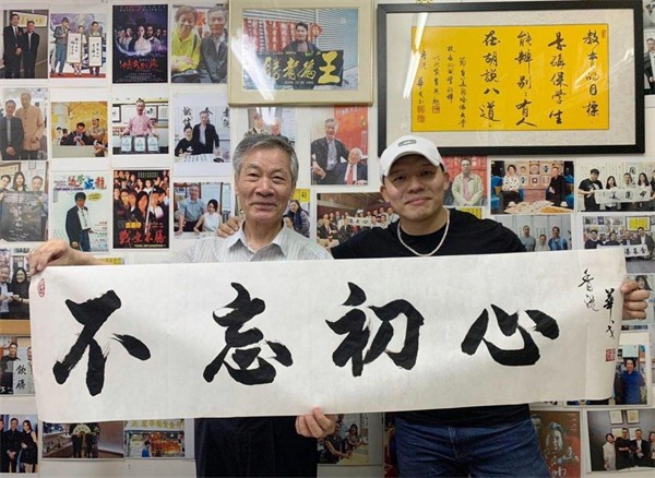 香港影壇御用書法家華戈(左)親題「不忘初心」墨寶予李振邦。