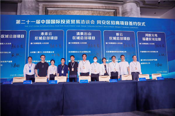 9月8日下午,第二十一屆中國國際投資貿易洽談會同安區招商項目簽約儀式和新聞發布會在環東海域新城波特曼七星灣酒店舉行,40個項目上台簽約。本屆「9·8」投洽會期間,落地及達成合作意向總額968億元。