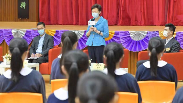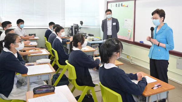 林鄭月娥說,今年開始成為高中核心科目的公民科能讓學生透過學習香港、國家及當代世界的議題,配合其他高中學科,建立廣闊的知識基礎和正面的價值觀,成為對社會有承擔、具國家觀念、香港情懷和國際視野的新一代。很高興在新學年之始探訪學校,看見校方、老師和同學都積極投入該科目的教與學,教育局會繼續為學校提供有關支援。