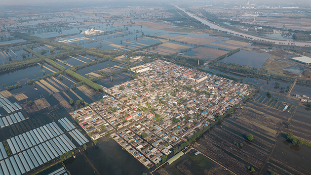 頂圖: 10月11日,山西省介休市,洪水倒灌南橋頭村,致使村莊積水嚴重。中新社