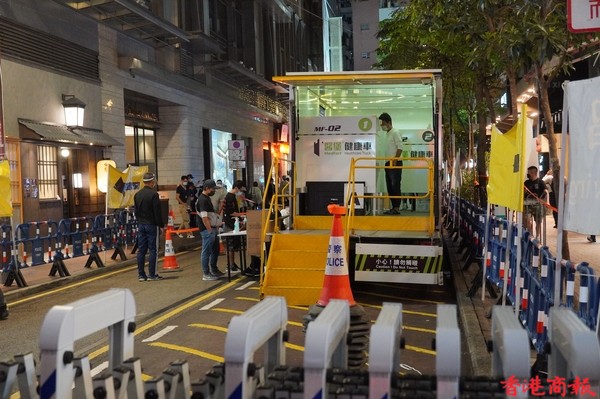 據了解,該大廈有超過260戶、逾400人要強檢。今晚7時前,約數十名警員展開圍封行動,先到達凱譽門外拉起封鎖線,隨後有運送物資的貨車抵達現場,警方在棉登徑對出的車路拉上鐵閘,放上圍柵,並疏導人流。(圖:記者 馮俊文 攝)