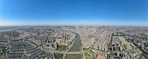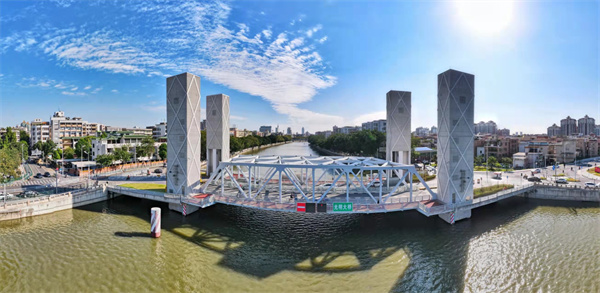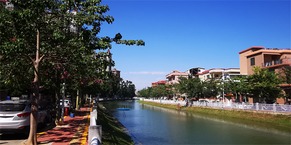 白天,藍天白雲下,河涌的水更加清亮,碧波與藍天相映襯;