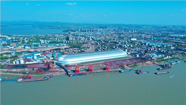 散貨堆場是老港區重點污染源之一。為了徹底解決這一環保「疑難雜症」,岳陽新建了1座長470米,跨度110米,高度46.5米,堆料面積5.17萬平方米膠囊式散貨封閉料倉,該倉獨特的「膠囊」型設計方案為國內首創,面積為亞洲同類型最大,這也是長江流域目前唯一一個全封閉作業系統。