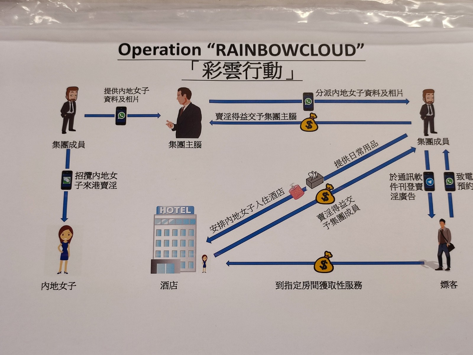 有見及此,在本年8月中展開代號「彩雲」掃黃行動。經過深入調查和情報分析,警方鎖定一個活躍於觀塘區內的賣淫集團,並於昨日展開收網行動,共拘捕11男16女,年齡介乎25至57歲,當中4名男子,年齡介乎25至42歲,2人有黑社會背景,涉嫌「依賴他人賣淫的收入維生」、「協助未獲授權進境者進入香港」,相信該4人是活躍區內賣淫集團的骨幹成員。