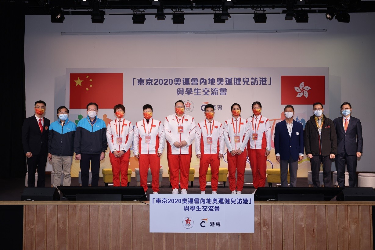 另一邊,5位金牌運動員,包括女子場地單車團體爭先賽金牌得主鍾天使、女子舉重87公斤級金牌得主汪周雨、女子舉重87公斤以上級金牌得主李雯雯、男子舉重73公斤級金牌得主石智勇、女子500米雙人划艇金牌得主孫夢雅,以及隨團的中國國家賽艇隊教練張秀雲,一行6人前往港專馬鞍山賽馬會本科校園,與200多位本港小學、中學及大專生互動交流,分享奧林匹克精神與他們多年來的拼搏歷程。