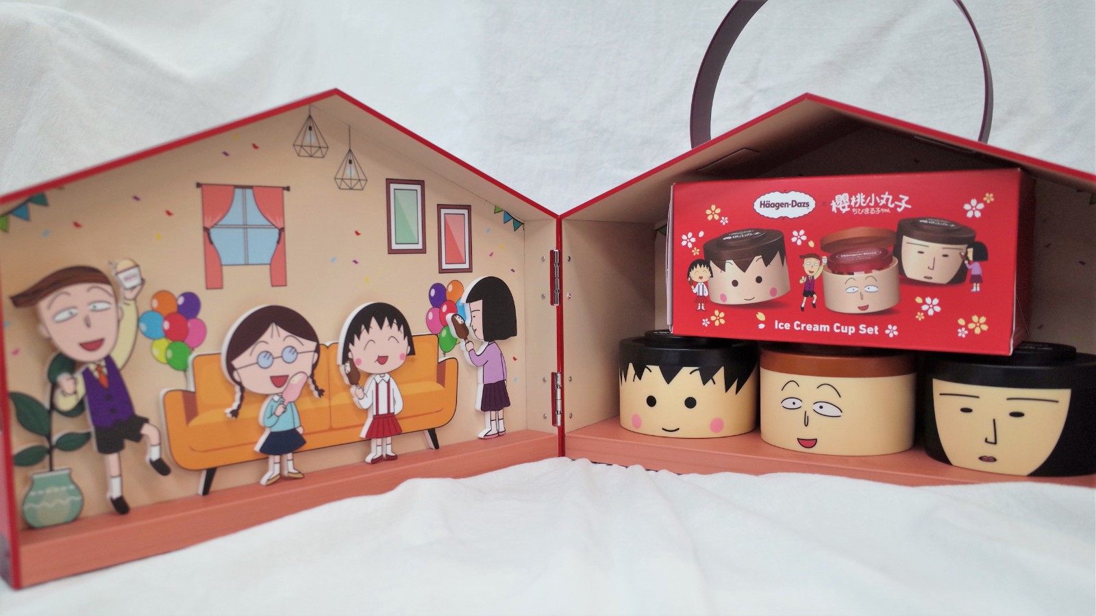 雪糕杯設計獨特,採用小丸子與好友的經典表情,外形搶眼吸睛,打開頂部蓋子,內有雪糕一杯,雪糕杯可循環再用,擺放其他物品,亦可疊高作裝飾,為家中或辦公室角落增添趣味。除此之外,品牌專門店及eShop限定推出節日福袋,內有三個小丸子、花輪同學及野口同學的大頭造型設計雪糕杯,加上家庭裝雪糕一盒 (可於Häagen-Dazs專門店換領時選擇2款雪糕口味),連同可愛、實用的小丸子粉紅冰袋,適合作為朋友聚會的禮物。