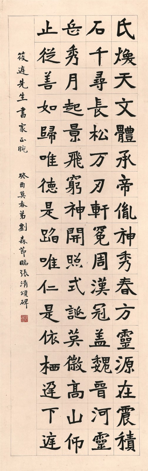 劉森(現代),書法雅號僧然。國家一級美術師。黑龍江省老藝術家協會秘書長,(美國)國際多棲藝術家協會常務理事、發起人之一,中國人才研究會會員。黑龍江省美術家協會、書法家協會、作家協會會員,炎黃文化研究會理事。自幼師從著名書法家王田習書,多年潛心研究甲骨、石鼓、商周銘文。其作品在國內外二十餘家報刊雜誌上發表,特別是在日本數次展示,被日本友人稱為一流書法家。其書法作品被國家民政部、各大圖書館、日本、韓國、新加坡、美、德、俄羅斯等國友人收藏。劉森的《臨張清頌碑》楷書作品,形體方正,結構嚴謹,拙筆書之,頗具碑帖斧鑿味道。